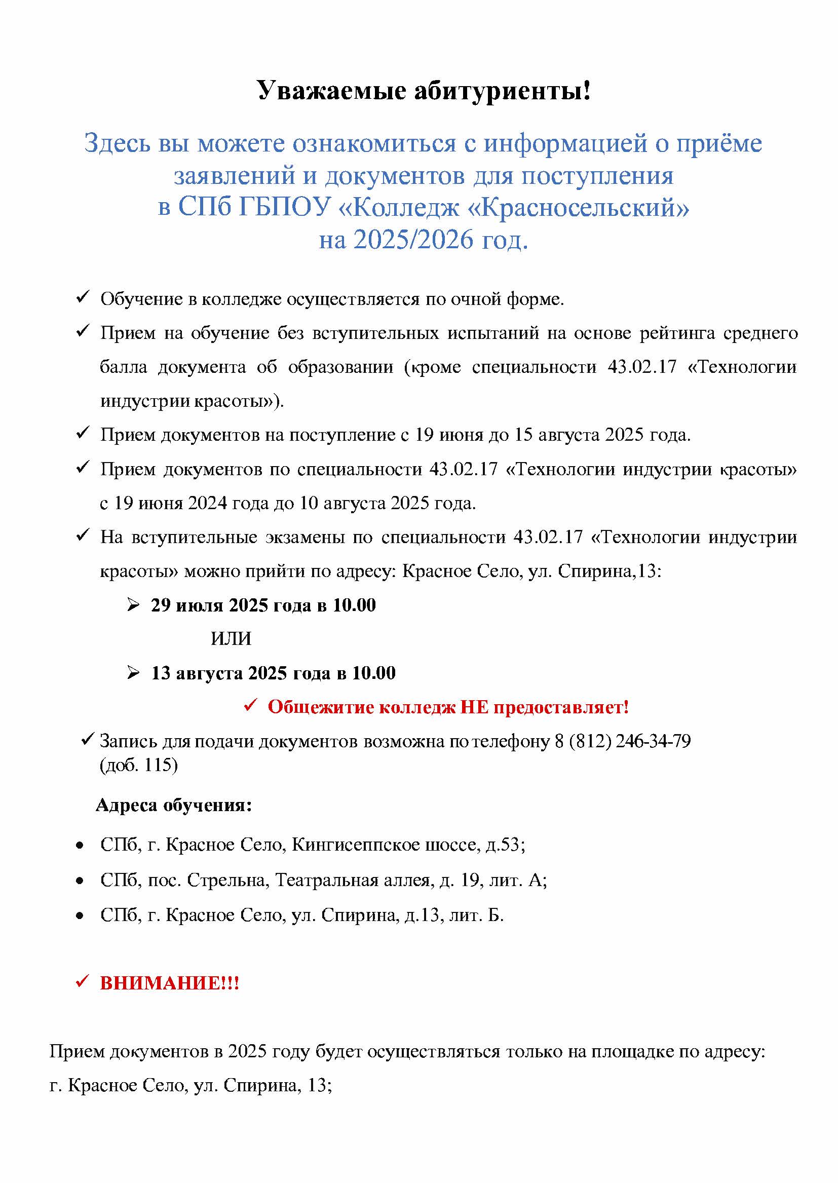+7 (812) 246-34-79 приемная комиссия (добавочный номер 106 или 115)